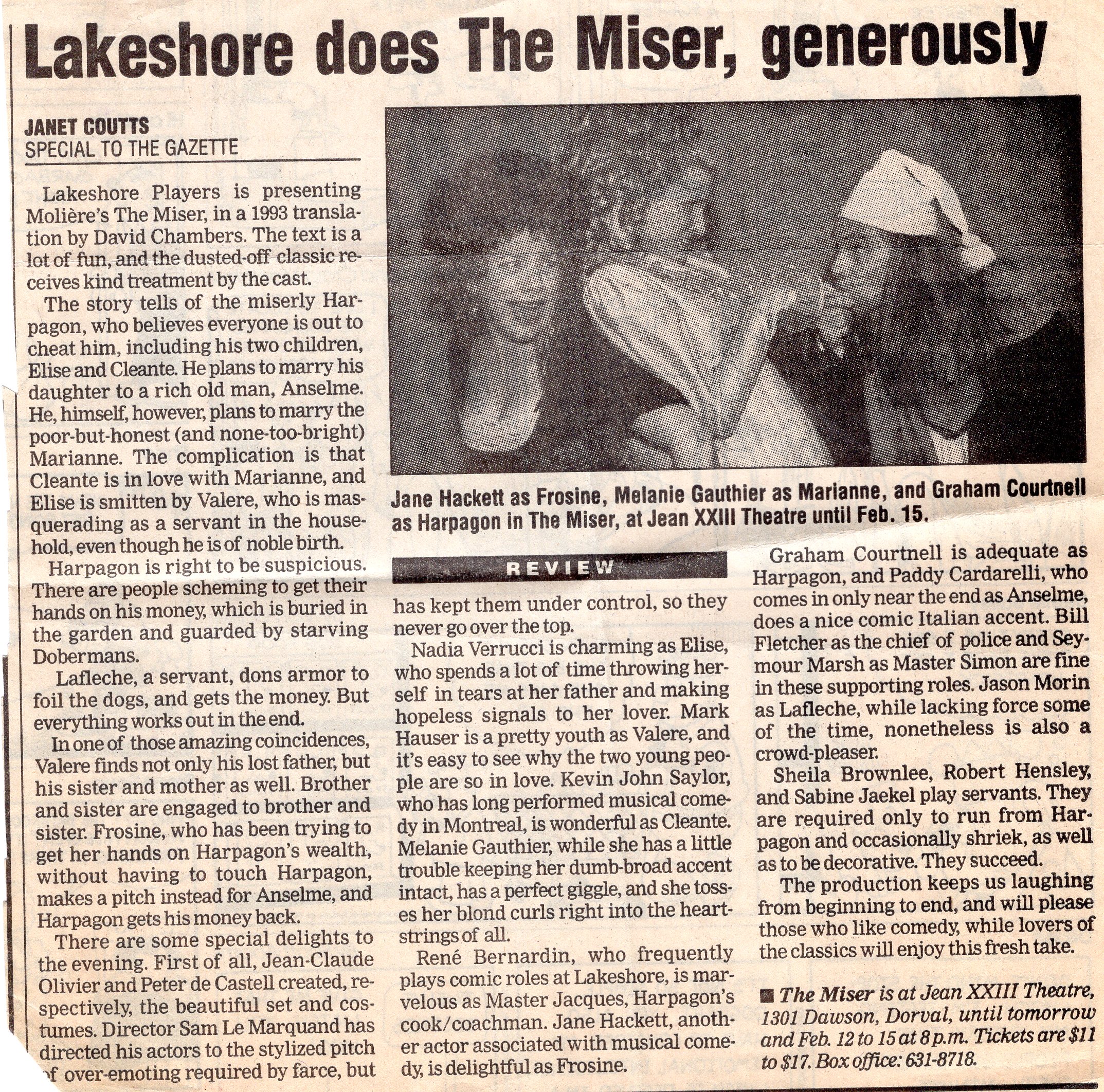| STEVE GILLAM as The Mayor JOYCE CHABOT as The Mayor’s wife MÉLANIE DESJARDINS as Mary BRIAN HAMMOND as The City Solicitor/ Elder Swensen KONSTANTIN (KOSTAS) KOKOSOPOULOS as The Superintendent of Schools ERIC SAUVÉ as The Lobbyist for Medical Insurance PADDY CARDARELLI as The City Controller VICKIE KUCHLEIN as The Communications Director JIM VOYSEY as Bobby Frick SHARON ADAMS as Bobbie Frack SIMON COTÉ as The Police Chief LINDA SHESHKO as The Hotel Manager/Mrs. Jameson LAURA MCDOUGALL as Mrs. Enright JEREMY GLENN as The Police Sergeant/The Man in Black JORDAN MARCHAND as Buttermilk WILLIAM GRAY as ZIPPO |